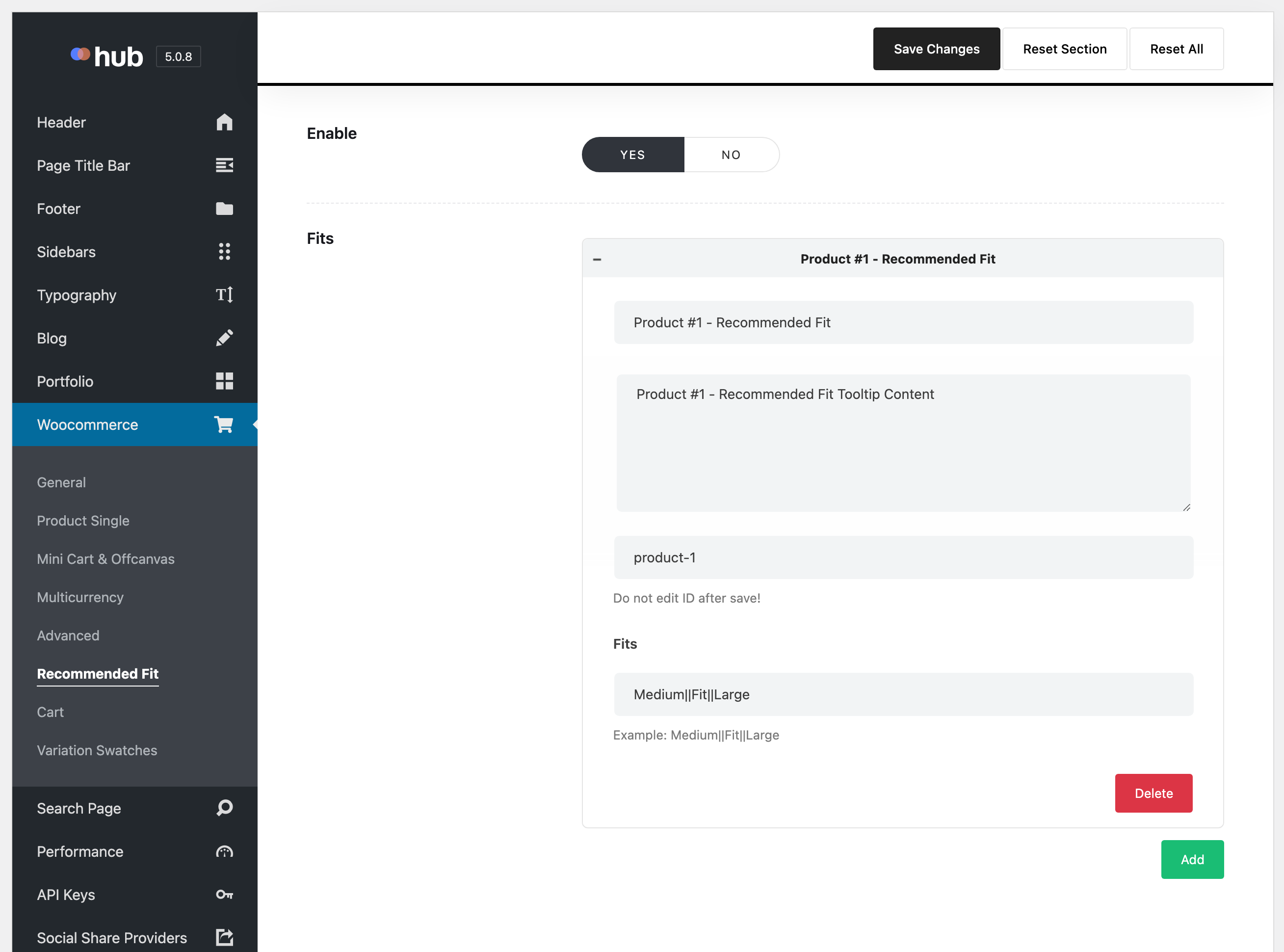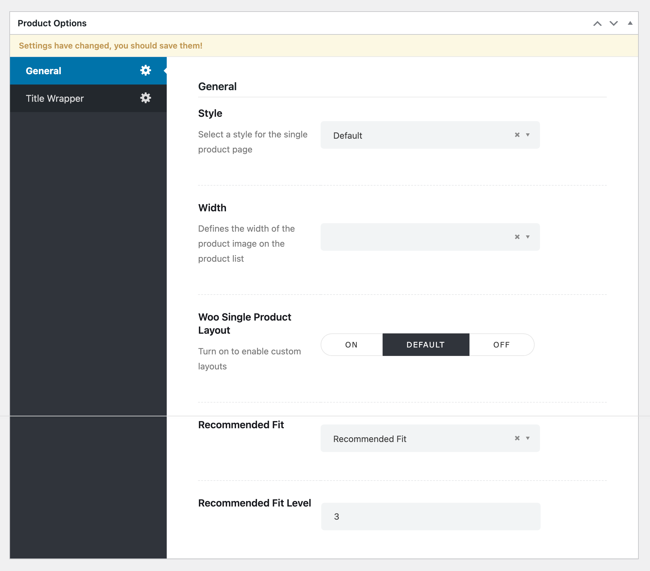 - In the WordPress dashboard, go to Hub > Theme Options > WooCommerce > Recommended Fit.
