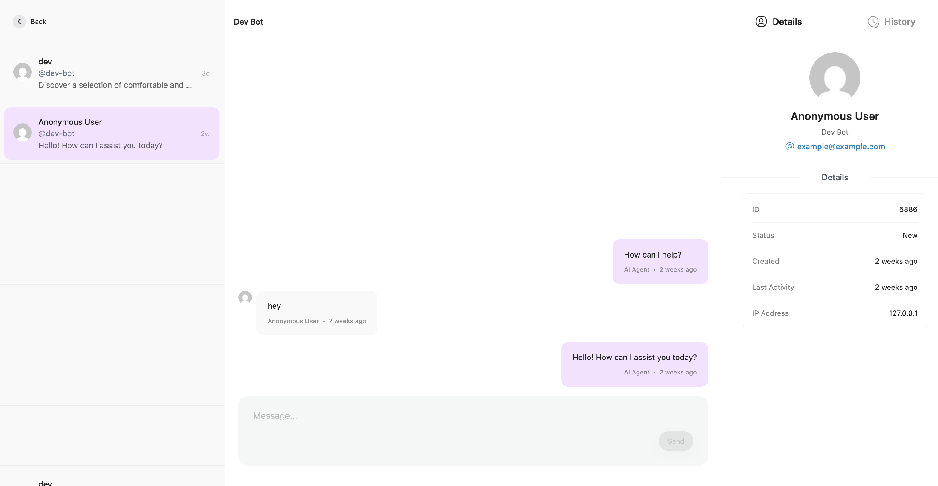 Proceed to the Hub AI Agent > Chats section to access the complete chat history. This feature enables you to engage in real-time conversations, assuming the role of either the customer or a real agent.