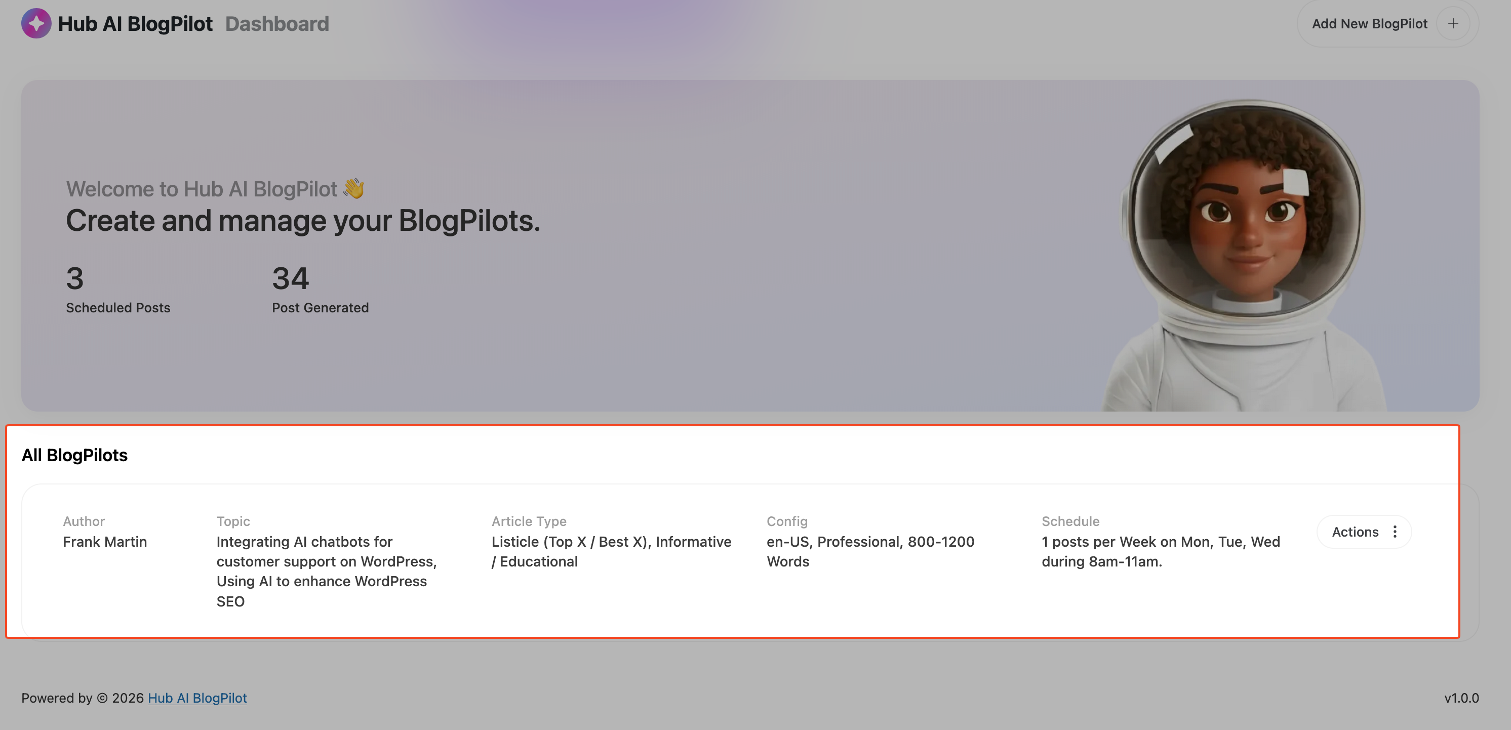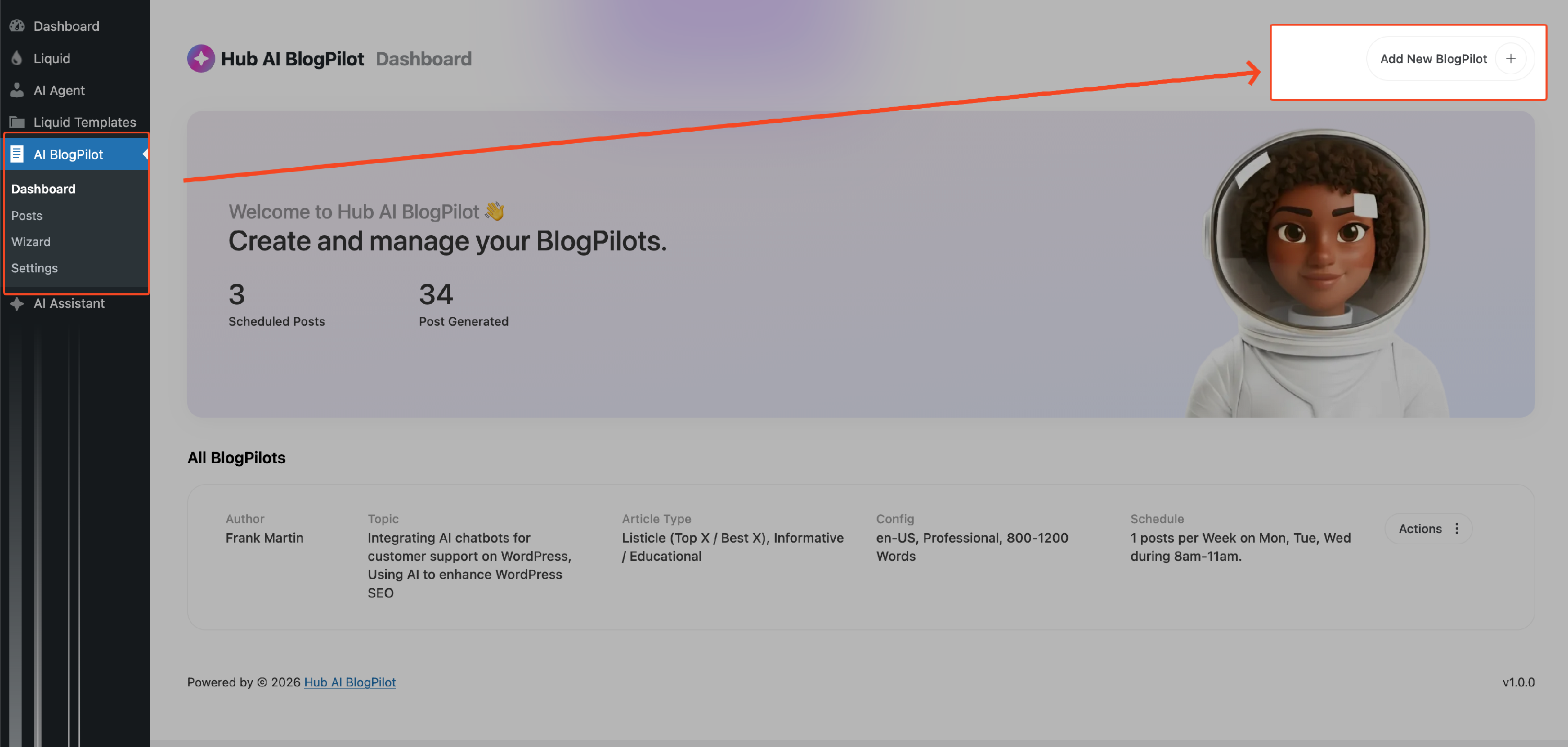 To begin, go to the WP Dashboard > Hub AI BlogPilot > Dashboard and select the Add New BlogPilot button located in the top right corner. Follow the steps to easily create your posts.