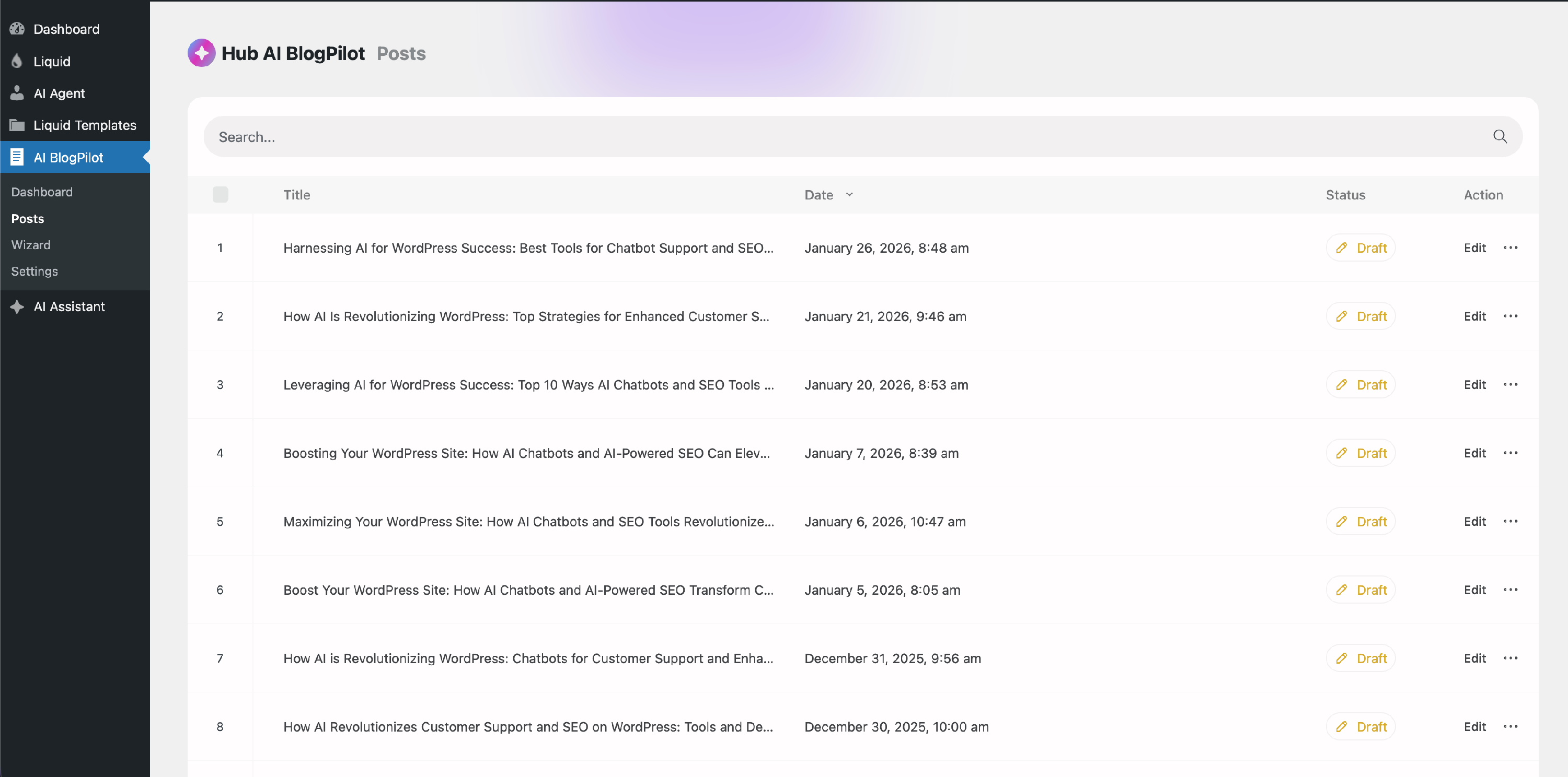 - Next, navigate to WP Dashboard > Hub AI BlogPilot